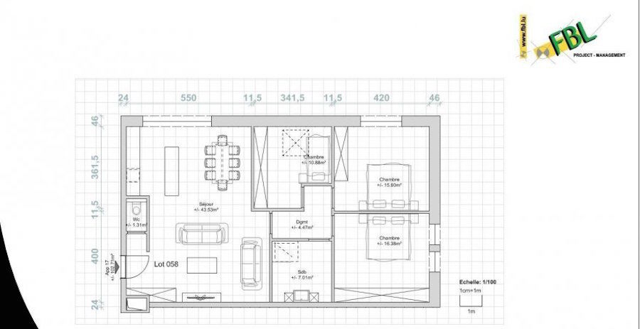En vente, nouvelle résidence à Rodange en l'état futur d'achèvement. L?immeuble sera construit avec une exécution et des finitions haut de gamme.Très joli appartement de 102,71 m2 au 3ième étage, avec trois chambres à coucher, grand living-séjour avec coin cuisine ouverte, salle de bains avec meuble pour lavabo, douche à l?italienne et WC, et une cave.